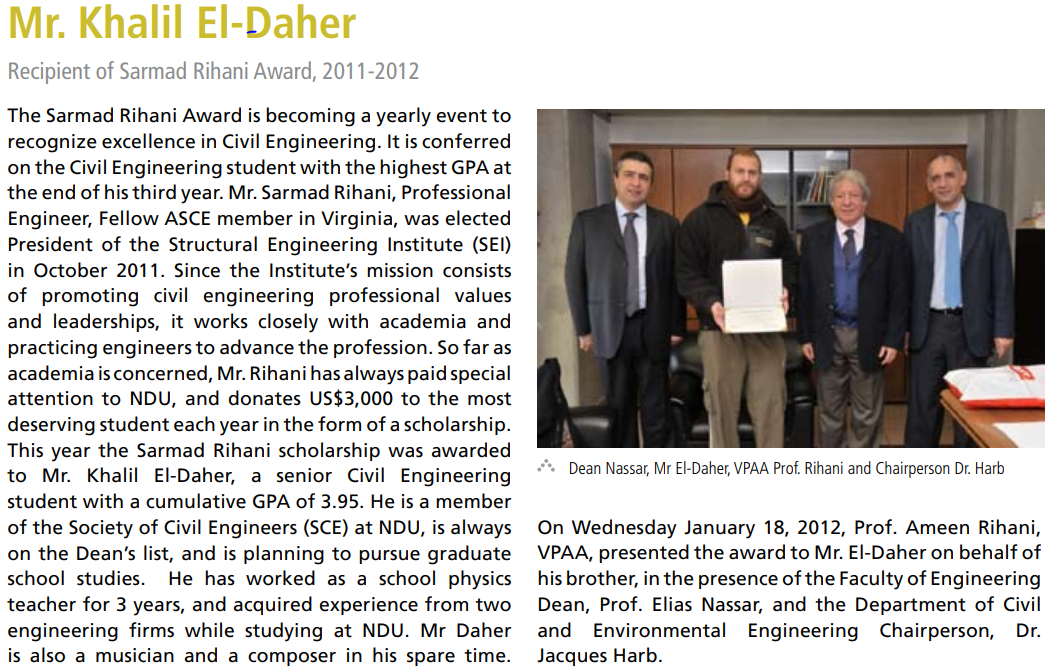 Received Sarmad Rihani award in recognition of excellence in Civil Engineering